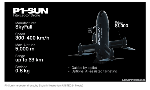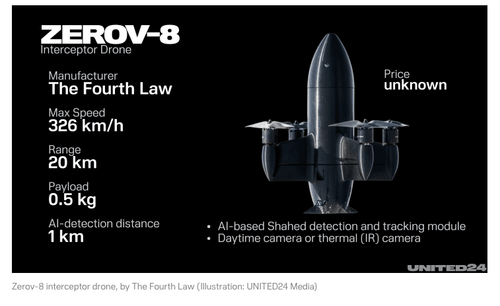 The interceptor can be guided by a pilot and, through AI, automatically lock the target during its final phase. The model has a daylight and a thermal camera, allowing it to detect Shahed engine heat at night. It can hold some warheads weighing 500 grams, according to the company.