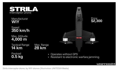 The STRILA, described by its manufacturer, WIY DRONES, as a “rocket-type air-defense” interceptor despite its four motors, can reach speeds of over 350 km/h and, during testing, was accelerated to 400 km/h, the company said.