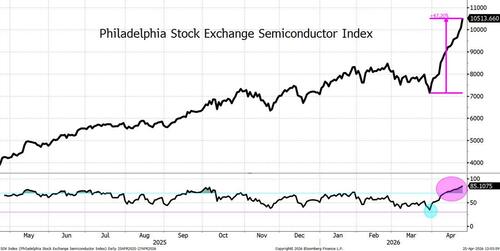The SOX index has jumped almost 50% since March 30th. That would be incredible, but 18 straight days of gains is wildly impressive! (Even the NY Mets could only do the same thing 12 days in a row, but in the other direction).